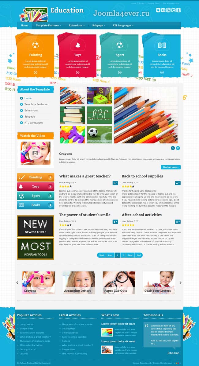 JM School Tools , created by developers from JoomlaMonster, specially created for an online store for children and school supplies. It is based on an adaptive element VirtueMart, which is essential for this category of sites. The bright color schemes and design, full of energy, set him apart from many similar patterns. JM School Tools has excellent typography, which uses a custom HTML-code and CSS3 effects. Thanks to the module DJ-MediaTools, which is part of the template, you can create a colorful picture with different types of paging. All possible features are available for testing in the demo version. This will help you in the shortest possible time to master the template and use it to create a quality website that visitors will be able to remember.