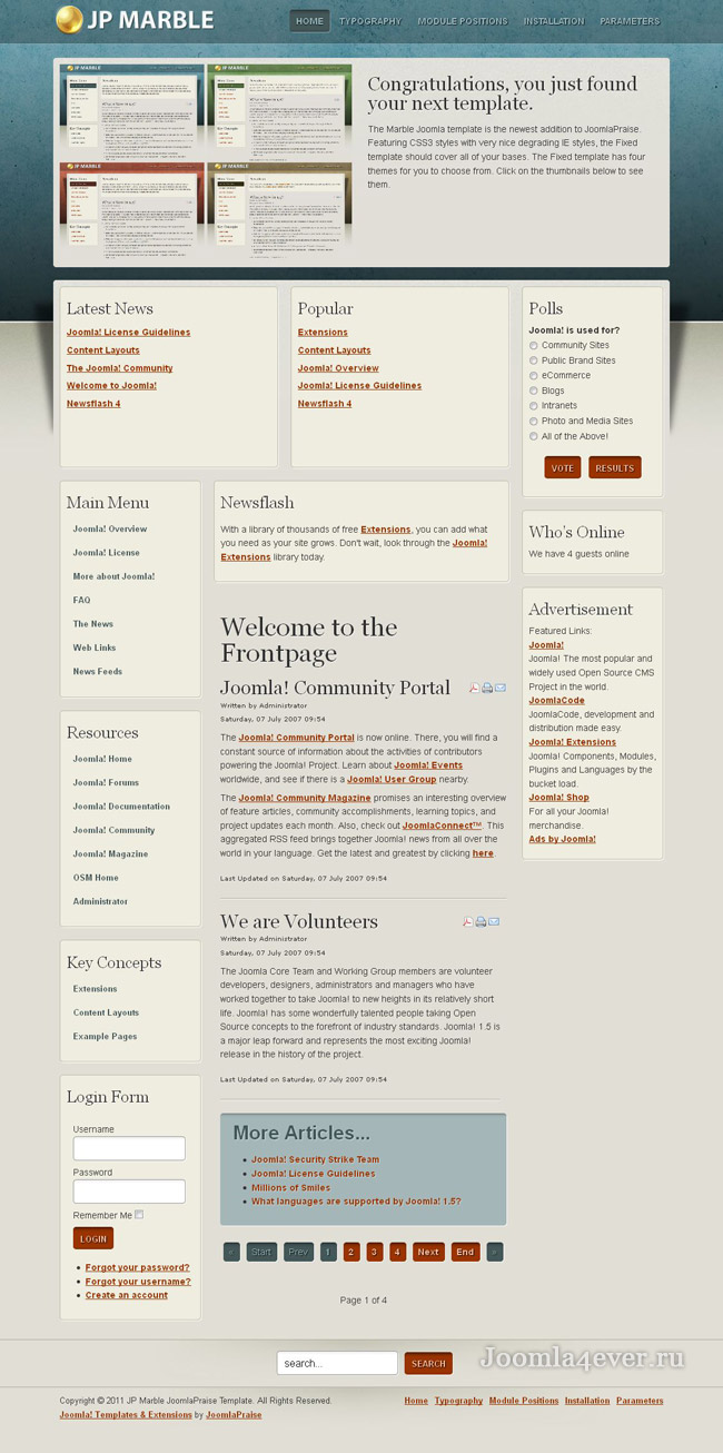 The new template JP Marble for CMS Joomla, Developed by JoomlaPraise, you have access to four different color schemes interface, 32 positions in which you can place modules, and many other cutting-edge technologies Web 2.0.