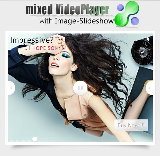 If you want to impress your site visitors, mixed VideoPlayer with Image-Slideshow is the best choice! Is designed to combine in a unic mode a gallery of images with numerous video files support (FLV, MP4 , MOV, Youtube and Vimeo). The image slideshow offers you the possibility to add SPECIAL effects, like Slide, Fade, Bright and Dark.