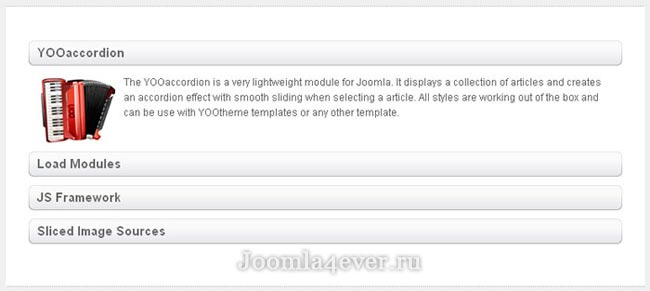YOOaccordion - гибко настраиваемый модуль для Joomla. Он отображает статьи из выбранной категории, в стиле аккордеона: медленно раскрывающиеся и закрывающиеся статьи. Все...