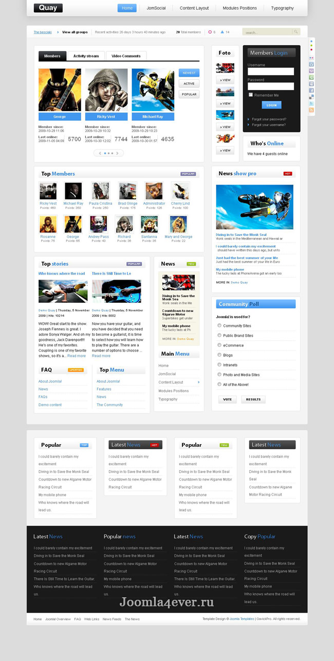 Вы легко поднимете свою собственную социальную сеть, использовав многофункциональный шаблон GK Quay для CMS Joomla от польских профессионалов из студии GavickPro. Дизайн шаблона организован в светлых тонах, тонкая настройка которых производится через административный менеджер настроек шаблона. Фирменная платформа Gavern студии обеспечивает полный контроль над любыми параметрами макета с использованием новейших веб-технологий. Шаблон корректно масштабируется под любые экраны мобильных устройств, имеет адекватное отображение во всех браузерах и очень быстро загружает страницы. Шаблон поддерживает плагины, в том числе поддерживается популярный компонент соцсети JomSocial 2.2.
