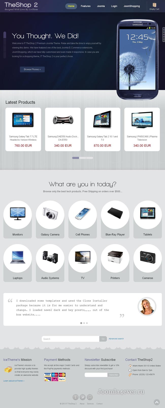 IT TheShop 2 – разработчики студии IceTheme создали вторую версию самого популярного шаблона для интернет-магазинов. Стильный и уникальный дизайн, который совмещен с функциональным компонентом JoomShopping (онлайн коммерция), предоставит вам возможность создать сайт на профессиональном уровне с огромным набором различных инструментов для более гибкой и наглядной продажи товаров. Для того чтобы пользователь мог оставаться на той же странице при добавлении товара в корзину, разработчики использовали Ajax технологию для корзины товаров. Шаблон качественно прорисован вплоть до самых мелких деталей, имеет множество новейших эффектов и шесть цветовых стилей. Разработчики позаботились о хорошей оптимизации, высокой скорости загрузки и совместимостью с любыми браузерами.