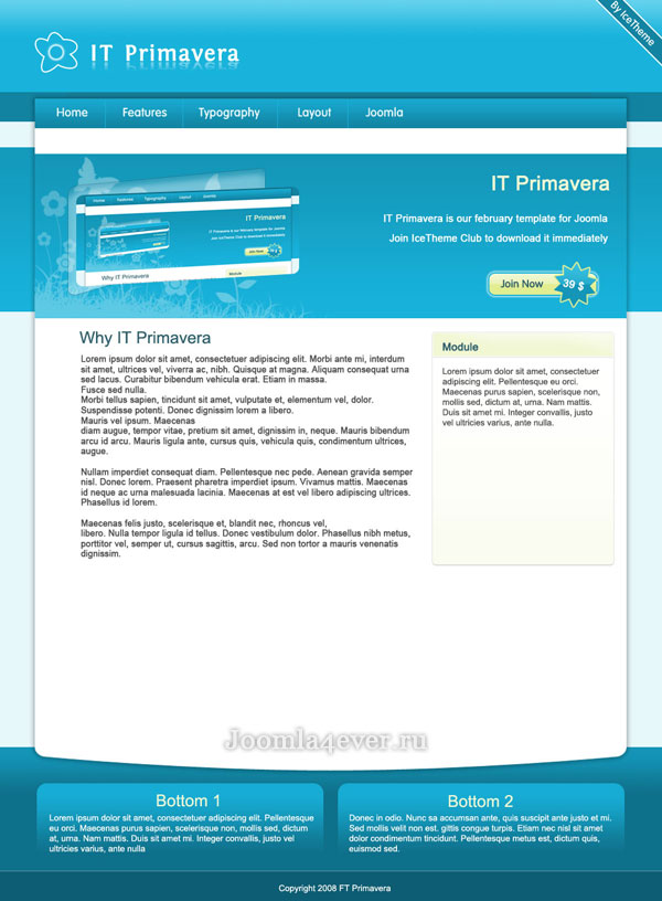 В качестве первого релиза в 2008 году студия IceTheme выпускает специальный шаблон IT Primavera. IceTheme упорно трудились, чтобы сделать этот шаблон доступным и приемлемым насколько это возможно. Он также очень прост и имеет много пробелов. Он имеет трех компоновочную схему, чтобы сделать его работоспособным с различными разрешениями экрана. Также Primavera содержит все основные модули и компоненты.