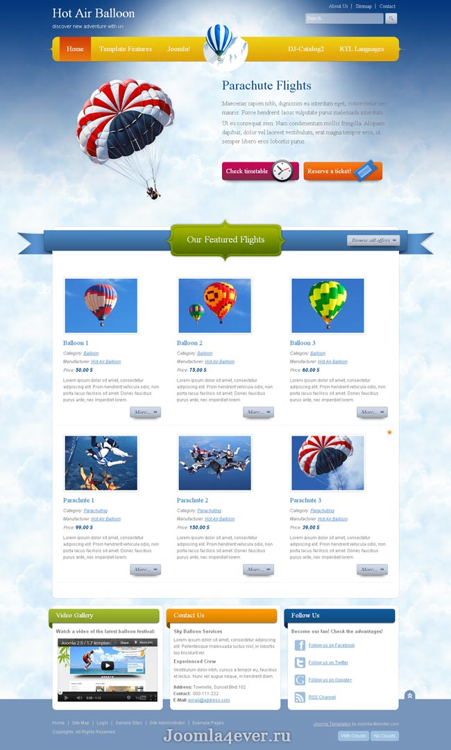 Разработчики Joomla Monster разрабатывают шаблоны и на тему туризма. Так, появился шаблон под названием - JM Balloon. Оригинальный макет с отличным дизайном. Чтобы настроить все параметры шаблона достаточно воспользоваться менеджером, он сделает быстро и без сложных манипуляций. Макет представлен в одной цветовой гамме вместе с четырьмя модульными стилями. Он имеет возможность комментирования кода файлов, оптимизацию файлов, а также гибкую модульную систему. Он имеет следующие достоинства, такие как поддержка мобильной и полной версии сайта, а также возможность просматривать сайт через планшет.