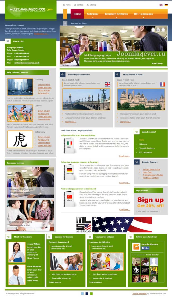 Another template offer for School and Education category addressed in particular for language schools. The demo website contains example custom modules that can be some kind of inspiration to draw from in order to display any information about language lessons, any intensive courses or presenting teachers profiles. What is more, it's worth to include eye-catching intro articles about countries culture to interest your potential customers in learning languages.