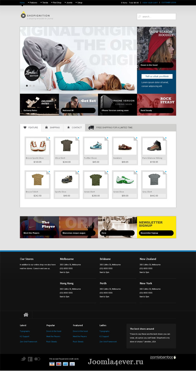 Специально для тех, кто собирается воссоздать свой собственный уникальный интернет-магазин или делает их постоянно, дизайнеры JoomlaBamboo приготовили стильный шаблон JB Shop Ignition. Помимо стандартного фреймворка Zen Grid и компонента К2, этот шаблон также поддерживает такие компоненты электронной коммерции, как Tienda и RedShop. Всё это, а также оптимизированная разметка сайта помогли в значительной степени ускорить прохождение операций при покупке чего-либо через сайт на шаблоне JB Shop Ignition на любых устройствах. Это поможет Вам и Вашим клиентам увеличить количество заказов.