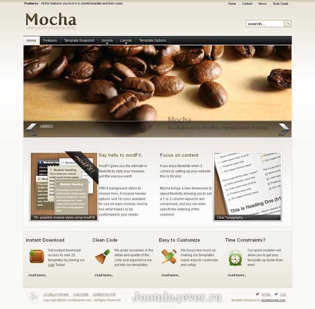JJ Mocha - шаблон, который имеет необычный дизайн. Разработан дизайнерами студии JoomlaJunkie. Как правило, этот шаблон используется для создания сайтов с деловым контентом. К этому располагает стиль этого шаблона. Приятным моментом в работе с этим шаблоном является быстрота его настройки. Кроме того сайт созданный с помощью этого шаблона без проблем отображается в большинстве мобильных гаджетов.