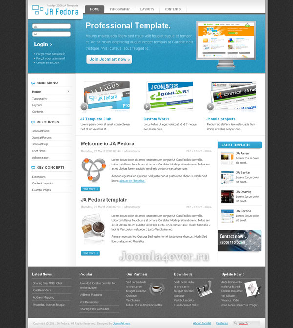 Очень часто шаблоны, которые используются для деловых сайтов – неразнообразны и скучны. Но нельзя этого сказать про новый шаблон Ja Fedora. В этом шаблоне существует несколько видов меню, которые позволяют успешно, что называется путешествовать по сайту. С шаблоном Ja Fedora ваш бизнес – сайт будет выгодно отличатся, прежде всего приятным дизайном. Для этого, кстати, в шаблоне встроены четыре разных цветовых решения – синий, оранжевый, зелёный и красный.