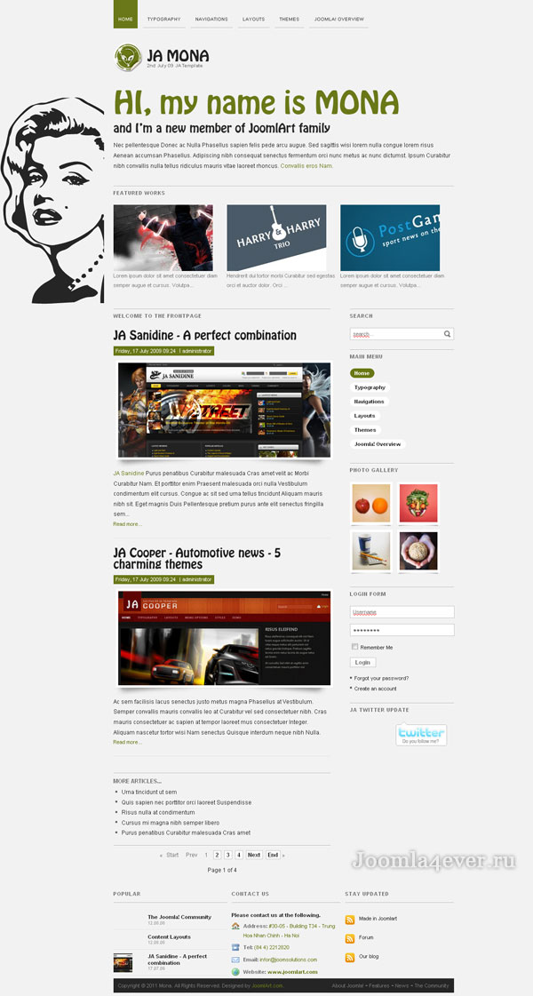 JA Mona - этот шаблон был разработан студией JoomlArt в июле 2009 года для того, что бы поддерживать работу блогов и постоянного обновления сайта. В арсенале этого шаблона имеется более десятка разнообразных стилей, с помощью которых вы сможете придать вашему блогу, либо же сайту яркий и неповторимый вид. Если сравнивать шаблон JA Mona с его более старыми предшественниками JA Koniga и JA Kruger, то новый продукт обладает большей гибкостью при работе с ним, а так же он обогащён такими программными модулями как JA Twitter, JA Highslide, JA Content Slider и JA Bulletin. Также в новом шаблоне JA Mona есть возможность добавлять разнообразные фоновые изображения, что без сомнения придаст сайту или же блогу свою индивидуальность.