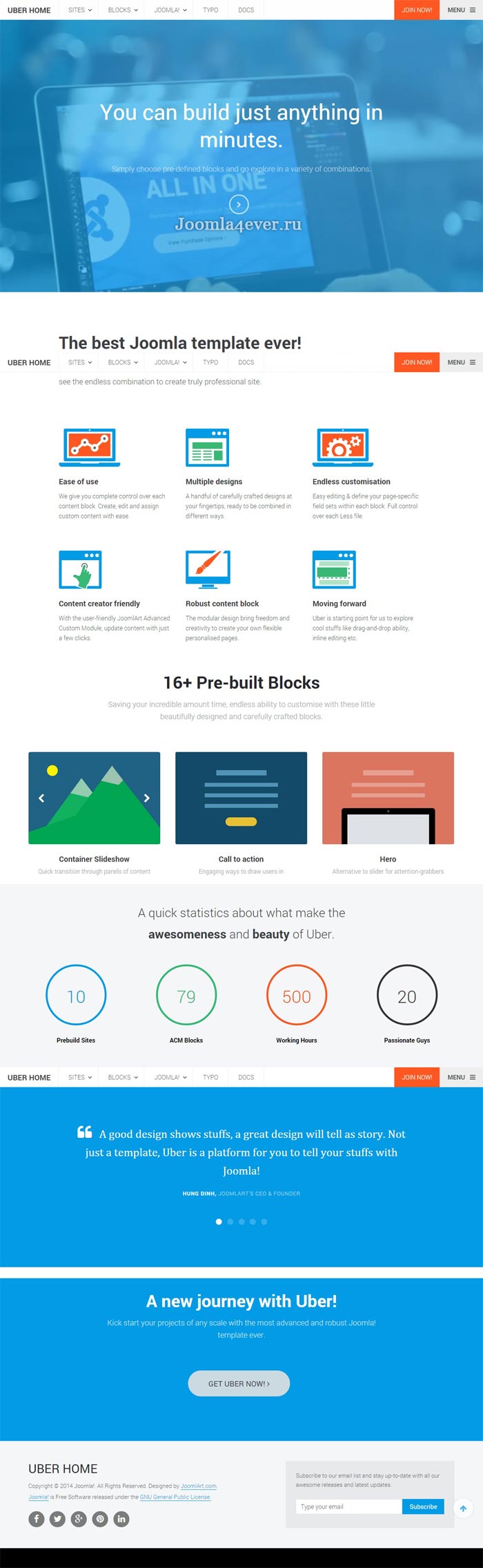 JA Uber – отличный шаблон для веб-ресурсов бизнес направления. Так же с его помощью можно создать корпоративный портал или сайт визитку. Над его создание работали дизайнеры студии JoomlaArt. Главная особенность данного шаблона состоит в размещённых в нём по умолчанию трёх макетов. Все они выполнены в стиле landing page с преобладание светлых тонов. Благодаря этому, JA Uber можно считать одним из лучших для создания веб-ресурсов бизнес направления, которые могут предоставлять услуги как онлайн, так и офлайн. Шаблон создавался на базе платформ T3 Framework, Advanced Custom Module и Twitter Bootstrap 3. Благодаря этому, функционал CMS Joomla был значительно расширен. Ещё хотелось бы обратить внимание на то, что разработчиками был встроен в шаблон компонент JA Advanced Custom Module. С его помощью администратор ресурса может легко управлять расположением блоков на ресурсе, например, галереей, слайдером или любым другим контентом. Используя совместно ThemeMagic и Layout Configurator, администратор получил возможность создавать ресурс с нуля прямо из административной панели.