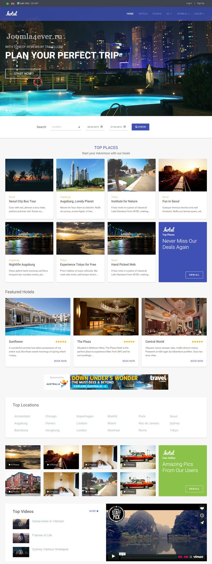 JA Hotel - эксклюзивный шаблон для версии Joomla 3.3, предназначен для создания стильного сайта туристической тематики. В частности, шаблон можно использовать за основу для веб-сайта компании с туристическим направлением деятельности, для бронирования гостиничных номеров и билетов на путешествия. Использованный в процессе создания шаблона компонент Solidres позволил создать специальную форму для бронирования на CMS Joomla. Приятный интерфейс главной страницы отражен в форме большого широкоформатного слайд-шоу в котором есть специальная форма для избрания конкретного отеля в определенном регионе, бронирование гостиничных номеров и указанием выдающихся мест в определенных городах. С помощью шаблона JA Hotel, веб-сайт можно превратить в настоящего справочника для туриста. Для этого, достаточно поместить информацию об интересных местах за рубежом, выдающихся архитектурных достопримечательностях, особенностях культуры определенных народов, информацию о национальной кухне каждого региона и интересные мероприятия, которые планируются в будущем. Разработанный JA Hotel с использованием последней многофункциональной версии фреймворка T3 Framework, который поддерживается Bootstrap 3. Адаптивные свойства шаблона позволяют просматривать страницы с различных устройств, в этот перечень входят ноутбуки, планшеты и смартфоны.