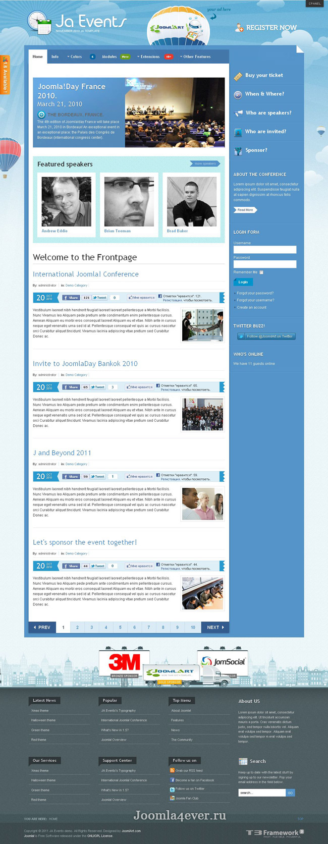 JA Events – отличный и оригинальный шаблон для известной системы CMS Joomla от профессиональной студии JoomlArt. Хорошую универсальность макету придает абсолютная поддержка компонента расширений онлайн коммерции VirtueMart и сверхмощного конструктора K2. Данный современный макет содержит в себе 5 схем цветового оформления с поддержку вспомогательных тем спец-оформления для K2, соответственных манере дизайна шаблона. Студийная платформа фреймворка JAT3 2 Framework полностью гарантирует, абсолютную совместимость со всеми планшетными и мобильными устройствами, а также придает скоростную загрузку интернет-страниц и добавляет индивидуальную функциональность веб-сайту. Шаблон JA Events безукоризненно подходит для созидания интернет-сайтов различной многосложности и тематики.