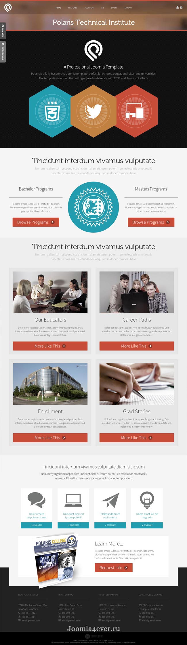 Профессиональным бизнес шаблоном является JXTC Polaris от разработчиков JoomlaXTC, который полностью поддерживается Joomla 2.5х и 3.х. Макет имеет элегантный дизайн, включающий CSS3 стили, которые с применением эффектов Javascript отлично сочетаются и придают особый внешний вид. Применение технологи Bootstrap CSS дает возможность поддержки мобильных и планшетных устройств. В шаблоне представляются 70 модульных позиций, четыре цветовые схемы, уникальные стили типографии и т.д. Фреймворк студии JoomlaXTC Framework дает возможность иметь полный доступ к любому параметру макета – корректированию ширины, выбору фона, цвету шрифт, пользовательским настройкам стилей и модульной компоновки. В состав сборки входят знаменитые студийные расширения - Contact Wall, Deluxe NewsPro Module и Html Pro Module.