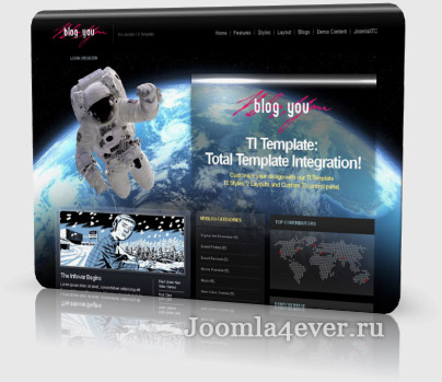 Оригинальный шаблон JXTC Blog You который разработала студия JoomlaXTC, этот шаблон называют еще космо-шаблон. С помощью этого шаблона JXTC Blog You можно легко создать свою собственную интернет-страничку. Также можно выбрать 12 уникальных стилей для оформления своего интерфейса. Сам шаблон был легко сконструирован на структурном фреймворке, это позволяет пользователю стремительно и легко управлять настройками прямо из панели управления. В самом шаблоне были встроены несколько новых тем, они предназначены для таких компонентов как IDOBlog и JComment. Сам дизайн этого шаблона был специально выполнен на CSS3. Также в него интегрированы дополнительные модули, совместим шаблон со всеми известными браузерами. Этот шаблон несомненно подойдет тем кто хочет создать свой уникальный, собственный интернет-дневник. Шаблон устанавливается на Joomla 1.5х.