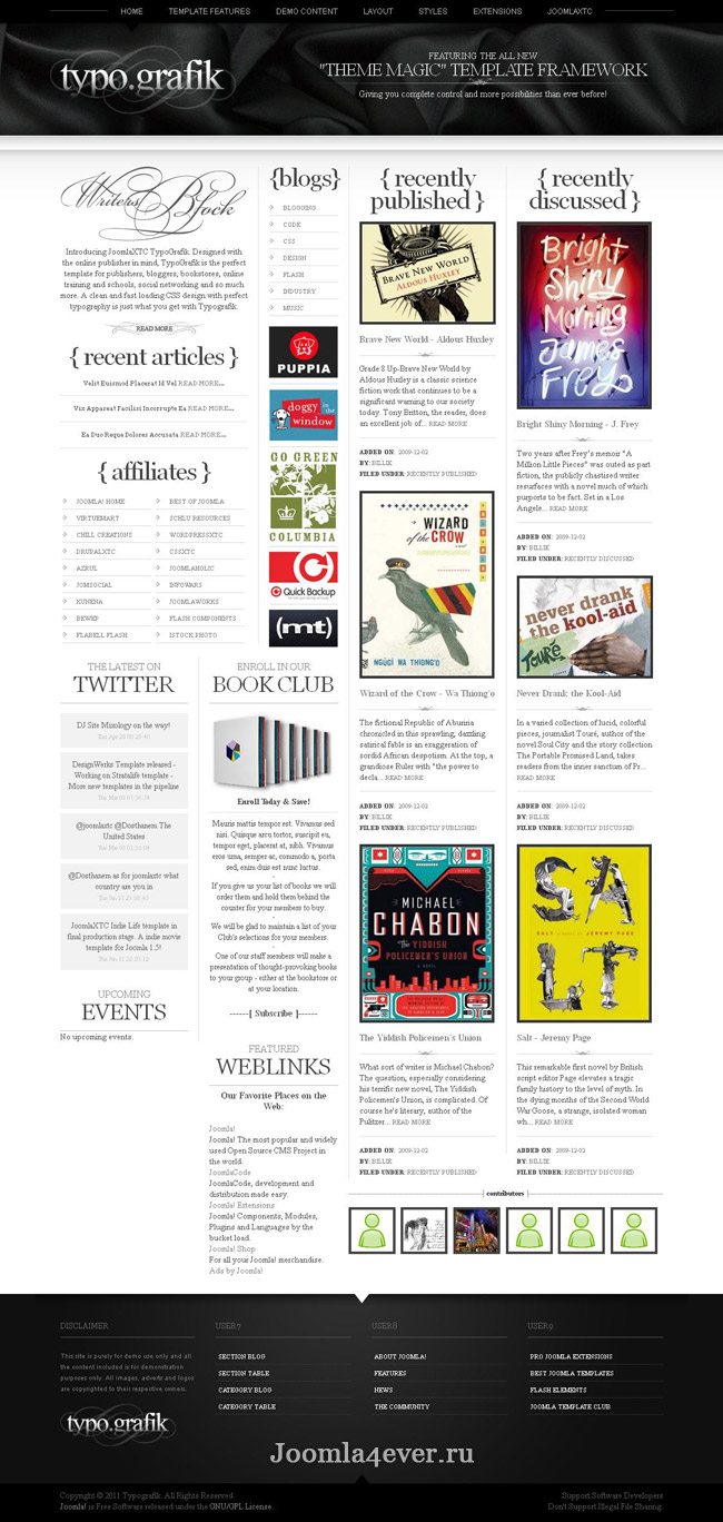 Очень восхитительный шаблон для создания своего блога - JXTC Typografik, этот шаблон был разработан студией JoomlaXTC. Также этот шаблон имеет совершенно новую платформу Joomla-themeMagic, эта новая платформа была добавлена в 2010 году. Этот шаблон имеет аж до 20 стильных модулей и 13 общих модульных позиций. Удачная структура этого шаблона позволяет очень быстро менять дизайн макета и придать совершенно новый уникальный вид вашему проекту. Красивый и удобный дизайн может быть применен для различных сайтов. Это уникальный шаблон для сайтов компаний, книжных сайтов и популярных интернет блогов.