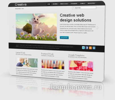 JS Creativa является обновленной версией шаблона для Joomla 2.5х от студии дизайна JoomShaper. Представлен дизайн шаблона в восьми цветовых различных схемах, которые позволяют создать ресурс для любой компании. Состоит модульная конструкция из 28 позиций для модулей, которые обеспечивают необходимое нахождение каждого элемента на страницах ресурса. Creativa поддерживает все браузеры и мобильные устройства, содержит отлично оптимизированный код для поисковиков, имеет моментальную скорость загрузки.