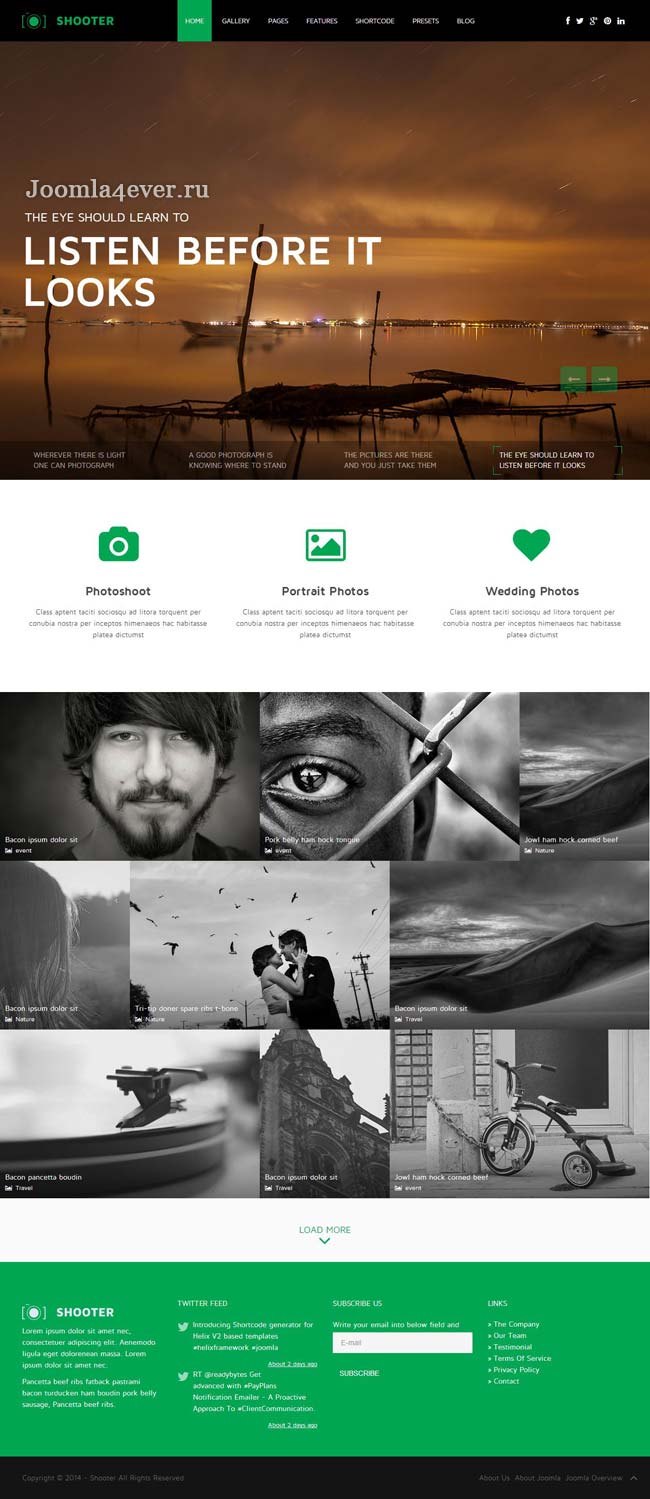Лучшая разработка за май 2014 года для фотографа - это шаблон JS Shooter от веб-дизайнеров компании JoomShaper. Шаблон позволяет создать сайт с фотографиями, портфолио или сайт-визитку для фотографа. В составе шаблона есть плагин jQuery masonry, благодаря которому можно просматривать свежие фотографии из галереи RokGallery, используя уникальный интерфейс Joomla ajax. Также при помощи расширения RokGallery имеется удобная и лёгкая возможность просматривать фотографии при помощи одного клика мыши. JS Shooter совместим как с версиями Joomla 3.3, так и с более поздними. Если Вы желаете создать свой сайт, где будут опубликованы разного рода фотографии, будь то профессиональные или нет, более удачного шаблона для этих целей Вам не подобрать.