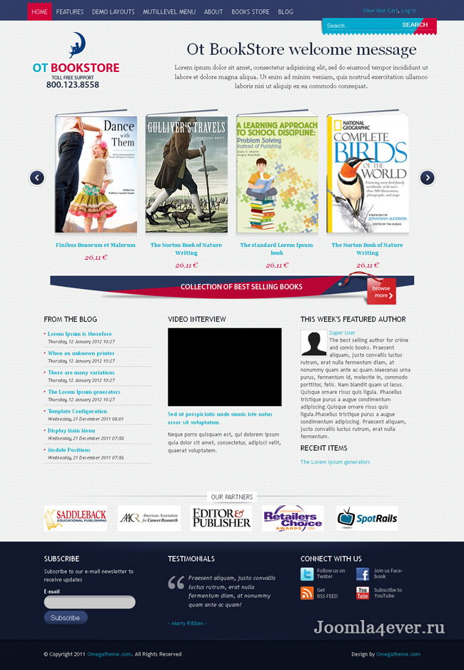 OT Bookstore – бизнес макет изданный в январе месяце компанией OmegaTheme. Он поддерживает такие популярные расширения, как К2 и Virtuemart 2.0. В макет встроены 3 цветовых стиля, его работа основывается на фреймворке Solid Framework, обеспечивающая хорошую скорость работы и оптимизацию кода, а также отличную работу расширений. Красивый и элегантный дизайн оптимально походит для создания сайтов разнообразной тематики. Шаблон в полной мере совместим с Joomla 2.5х и 1.5х.