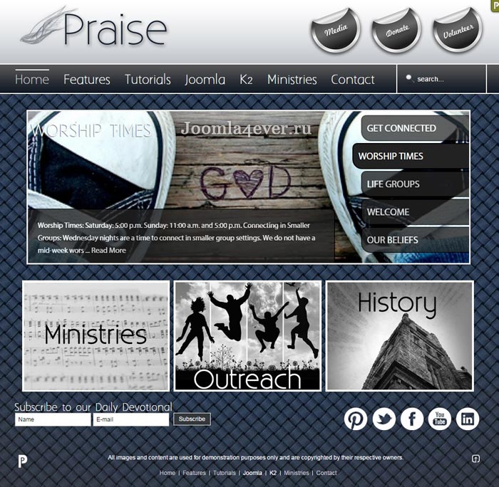 Praise is for anyone looking to make a site with a slick extension to showcase their content. It is a multi-use template and is well suited for Churches, Non-Profits, and Charity Organizations. It is packed with features and Rapid Content comes FREE with your purchase.