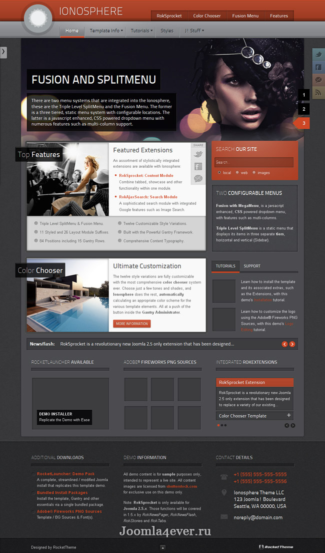 Всем известная дизайнерская студия RocketTheme порадовала пользователей новым профессиональным шаблоном — RT Ionosphere. Этот шаблон очень многофункционален. Пользователю предоставляется встроенная многофункциональная панель инструментов Color Chooser, с помощью которой можно быстро настроить цветовую гамму шаблона. Мартовский шаблон RT Ionosphere включает в себя совершенно новый и удобный модуль — RokSprocket. Он был разработан для того, чтобы заменить кучу существующих модулей предназначенных для отображения контента в разнообразном виде. RokSprocket имеет возможности таких расширений как: RokStories, RokTabs и другие. В будущем, разработчики планируют ввести сторонние компоненты K2 и ZOO. Модуль действительно мощный и полноправно заслуживает звания универсального расширения для отображения контента с хорошим интерфейсом и удобной настройкой. RokSprocket поддерживает лишь Joomla 2.5х - 3.x.