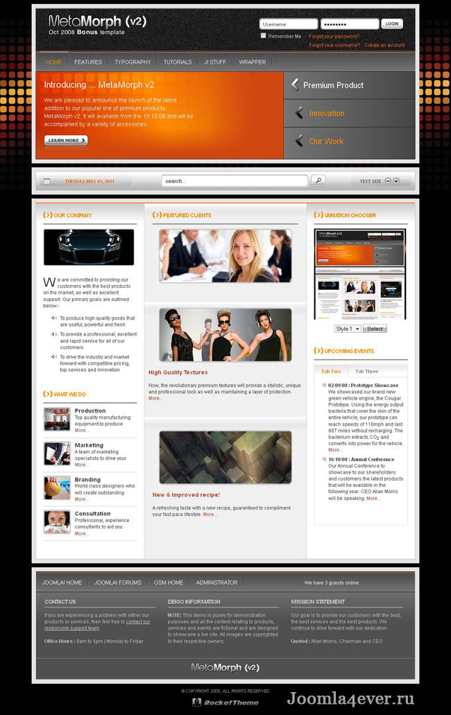 Шаблон RT MetaMorph v2 для Joomla 1.5х, разработан специалистами RocketTheme. Этот шаблон является дополнением к ранее выпущенному шаблону RT MetaMorph. Этот шаблон был сконструирован так, что пользователь сможет делать сайты практически любой сложности. Также в этом шаблоне были сконструированы 6 основных стилей для визуального оформления и более 25 позиций для размещения нужных блоков.