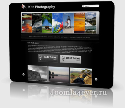S5 Kite Photography – шаблон для Joomla 1.5х для фото портфолио. S5 Kite Photography, который разработала студия Shape5, специально предназначается для создания обыкновенных фотоальбомов или же для сайтов фотостудий. Шаблон S5 Kite Photography для Joomla представлен в качестве двух модулей, размещаются в которых текстовый материал и фотографии. Шаблонные модули позволяют с легкостью управлять фотоматериалом. Специалистами студии шаблон S5 Kite Photography шаблон разработан в двух вариациях: в светлом и темном дизайне. В первом случае преобладает белый цвет, во втором - черный. Поддерживает данный фреймворк множество позиций под модули, размещаемые с материалом.