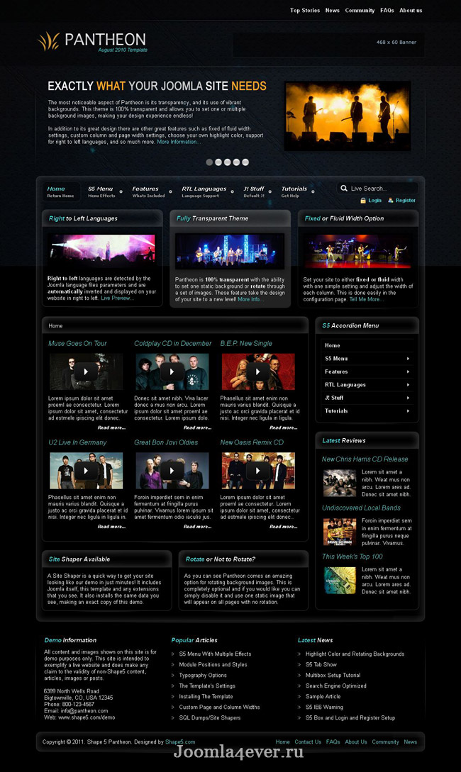 S5 Pantheon — красивый, современный шаблон, с эффектами прозрачности. Благодаря дизайну, шаблон подойдет практически для любых сайтов и любых компаний. Так же в шаблоне имеется динамический бекграунд, много красивых и плавных эффектов. В шаблоне присутствуют несколько встроенных расширений от студии «Shape5». Шаблон запросто можно подстроить под вкус любого человека, ибо он имеет 3 разных цвета и 34 модульных позиций. Шаблон тестировался на Joomla 1.5х – 2.5х - 3.x, нареканий нет, полная совместимость. Дизайнерская студия «Shape5» давно зарекомендовала себя как одна из самых лучших в сфере разработки шаблонов под различные CMS.