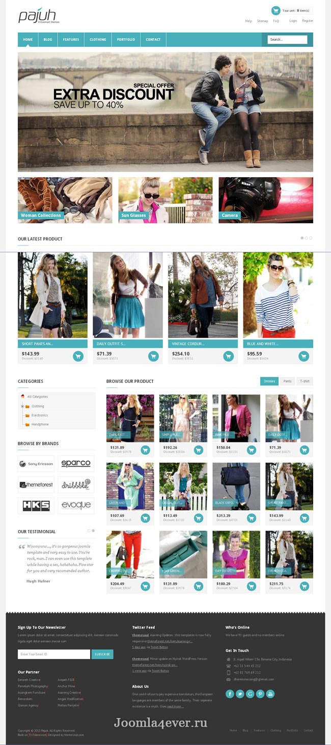 Шаблон TF Pajuh прекрасно подходит для создания онлайн-магазинов, разработан на основе комапонента VirtueMart и поддерживает Joomla 2.5х. В оригинальный дизайн шаблона предустановленны 5 цветовых схем, которые придадут любому сайту современный и уникальный вид. Абсолютный контроль над параметрами шаблона обеспечен благодаря мощному и функциональному фреймворку T3 Joomlart Framework, на основе которого разрабатывался макет. Адаптивные функции шаблона дают возможность корректно отображать его на любых мобильных устройствах. В TF Pajuh можно выбрать как модульную конструкцию, размеры элементов, так и настроить цветовую схему. Для улучшения гибкости и удобства в макет были интегрированы такие сторонние расширения, как Akeeba Backup FOX Contact, K2, Tabs GK5, AcyMailing и News Show Pro GK4.