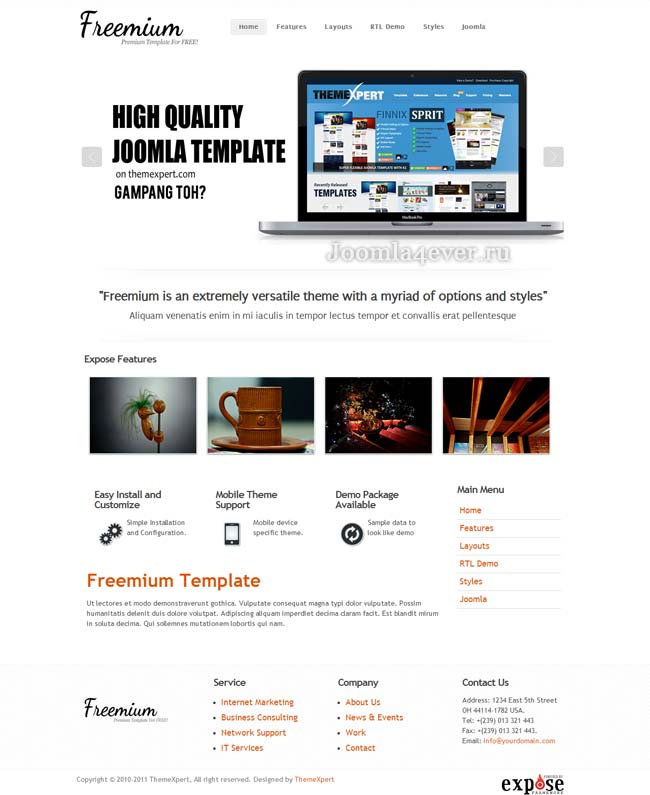 TX Freemium – бонусный бесплатный шаблон для Joomla, выпущенный в сентябре месяце 2011 года от продвинутых разработчиков ThemeXpert. Он использует весь функционал фреймворка Expose включая кросс-браузерную совместимость, поддержку мобильных устройств, блестящую типографию и т.д. TX Freemium использует CSS3 анимацию для воздействия на меню, цвет текста, цвет ссылок и т.п., что позволяет подогнать стиль под себя. Главной достопримечательностью TX Freemium является то, что его очаровательный дизайн довольно универсального характера, что делает его пригодным для любого типа веб-сайта. TX Freemium – основа качественного уникального интернет сайта.
