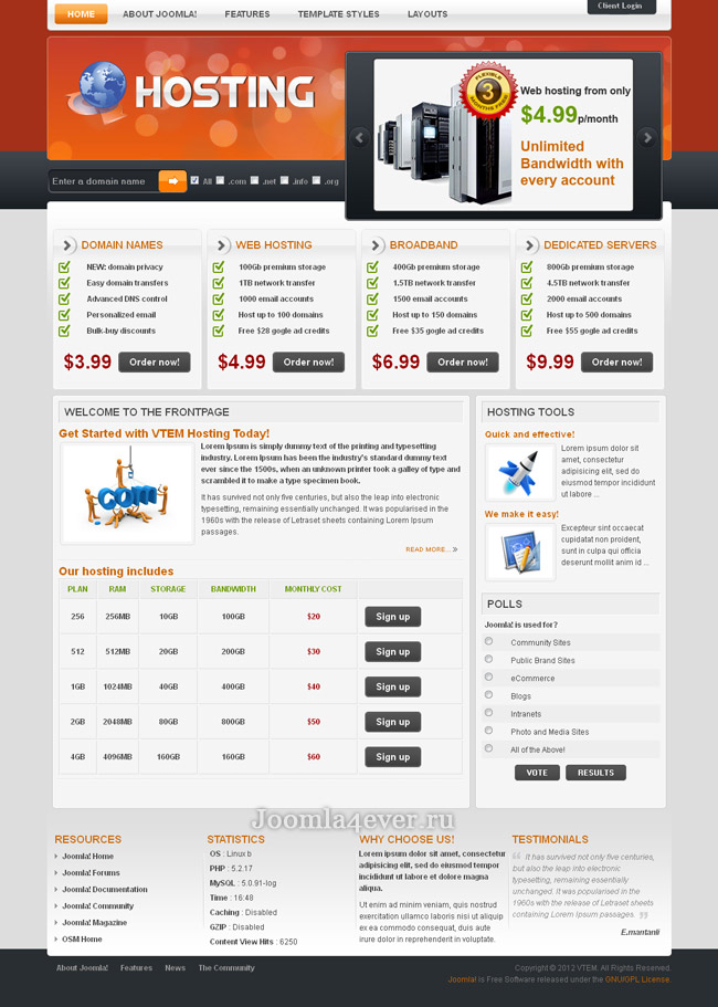 VT Hosting – стильный шаблон для ресурсов компаний, предоставляющих разнообразные услуги интернет-хостинга. Представлена цветовая схема макета в четырех вариантах (коричневый, синий, зеленый и красный), в модульной конструкции содержится более 32 позиций, благодаря которым есть возможность оптимального размещения на страницах сайта всей информации. Полной поддержкой компонента К2 обеспечивается получение гибкого и функционального каталога материалов. Отличается шаблон присутствием оптимизированного кода файлов и быстрой скоростью загрузки.
