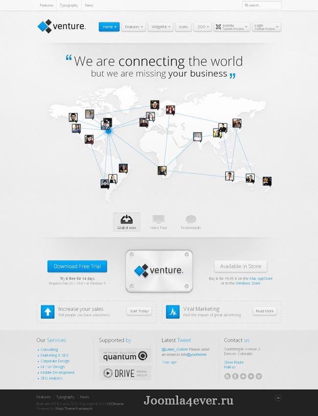 YT Venture - свежая разработка от знаменитой студии YooTheme, занимающейся веб-дизайном. Шаблон подходит для сайтов на CMS Joomla 2.5х и 3.х. Простой дизайн шаблона, исполненный в светлых тонах, прекрасно подходит для создания корпоративных проектов. Гибкие опции шаблона дают возможность комбинировать разнообразные фоны, стили и цвета, позволяющие сделать внешний вид сайта оригинальным. В шаблоне представлена гладкая анимация CSS, включен дополнительный функционал смены фона, внедрены нестандартные стили для Widgetkit-компонента. Этот шаблон реализован на функциональной платформе Warp6, которая использует стандарты CSS3 и HTML5, а также полностью поддерживает мобильные платформы.