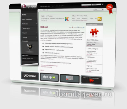 YT Rollout - разработанный студией YooTheme бизнес шаблон для Joomla. Основным элементом дизайна данного шаблона является стильное навигационное меню, с повышенным эффектом подсветки. Как обычно, отлично интегрируется YT Rollout шаблон с такими популярными модулями, как YOOcarousel и YOOslider.