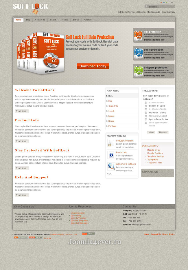 Если вам надо сделать интернет-презентацию, то шаблон YJ SoftLock поможет в этом. Благодаря простому макету и свежим цветовым решениям, вы сможете быстро создать уникальный и запоминающийся сайт-портфолио. Шаблон включает 15 модульных позиций и 3 цветовых решения. Этого вполне достаточно, что бы быстро наполнить ваш сайт контентом, сделав его запоминающимся для посетителей. Шаблон работает на Joomla 1.5, а его установка требует лишь пары секунд.